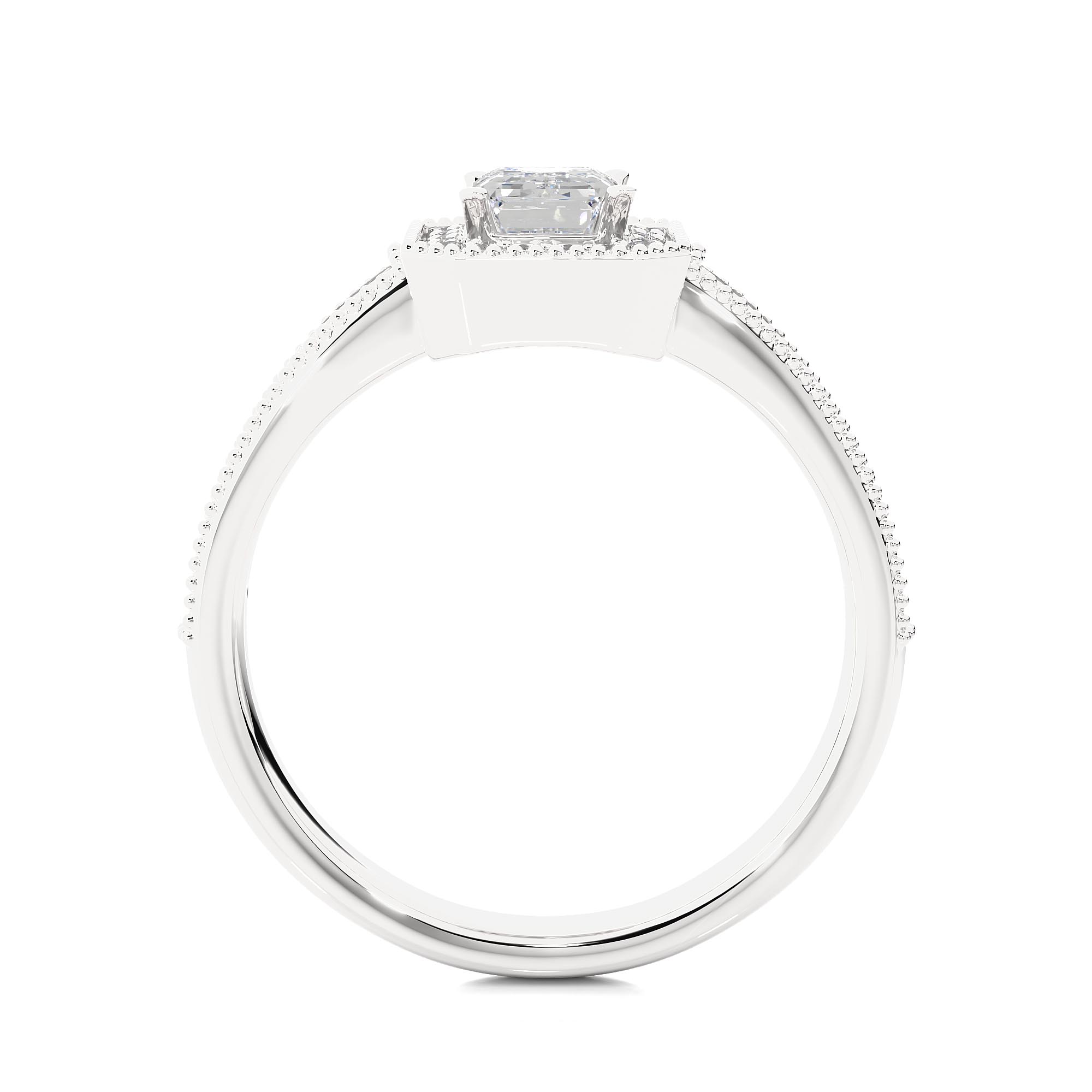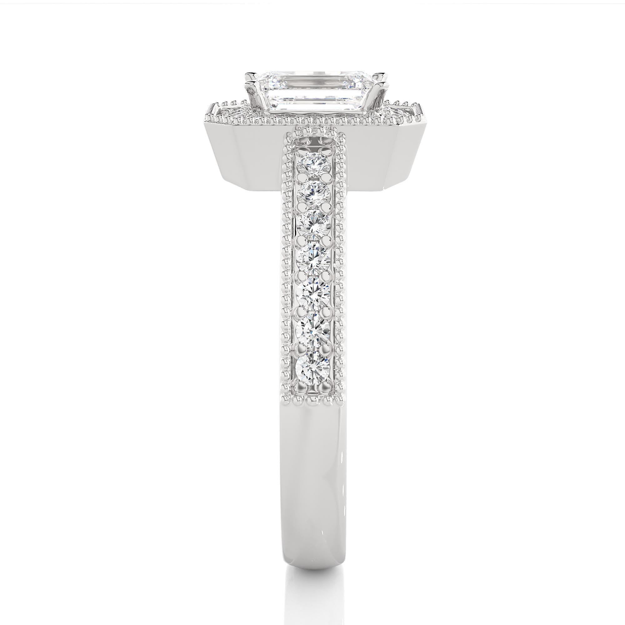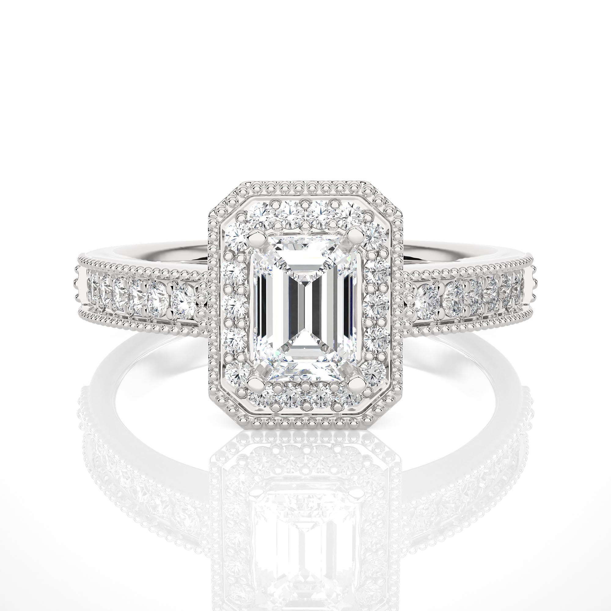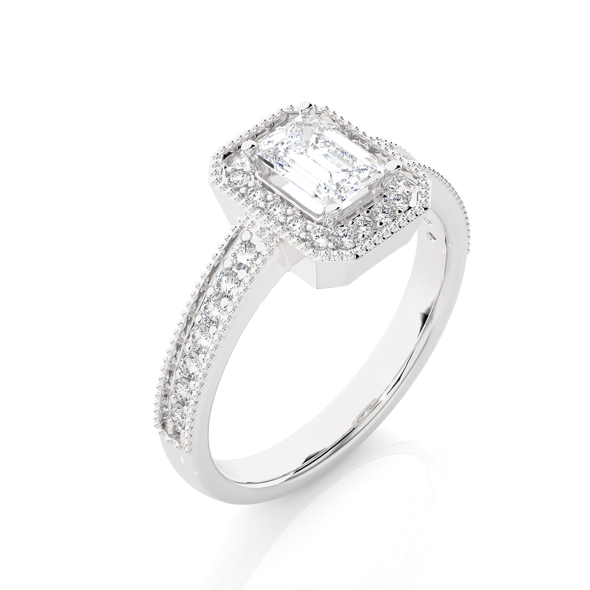 Emerald cut diamond solitaire with halo and diamond band – White Gold